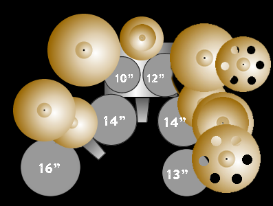 He recently subsitituted a 16" floor tom next to the hi-hat where a 13" snare drum was once used. An LP timbale is sometimes used to the right of the 14" floor tom.